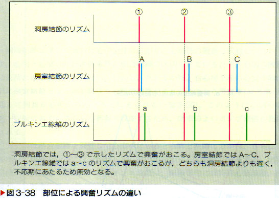 | 上に書いた「不応期」はなんとも困った伝導路の状態と思われるかもしれないが、これは2つの重要な仕事をしている。ひとつはあまりに高い頻度の電気信号の通過を妨げる仕組みのひとつである。つまり、あまり頻度の高い心拍の信号が無制限に通過すれば心筋は十分に応答できない、あるいはできたとしても心室に十分な血液を溜めることなく拍動することとなり、十分量の血液を、ひいては酸素を送ることが難しくなる。これを防止していると考えられる。もうひとつの理由は、心臓のペースメーカーは洞房結節であるが、心房と心室の間にある房室結節もヒス束もプルキンエ繊維も同様に独自に信号を発信できる能力を持っている。それらが勝手に信号を発信すれば心臓は混乱するはずであるが、実は混乱しない。その理由は洞房結節以外から発信される信号頻度は低く、頻度の高い洞房結節からの信号の不応期に当たるために無視されるようになっているおり、心臓の混乱を避けることになる(下図参照。医学書院「系統看護学講座 「解剖生理学」から引用)。しかし、もし洞房結節が何らかの原因で働けなくなると房室結節の信号が有効となるのである。しかし、実際はその信号だけでは問題となるために、ペースメーカーを埋め込んで直接心臓を支配する方法がとられている。 | ||||||||||||||||||||||||||||||||||||