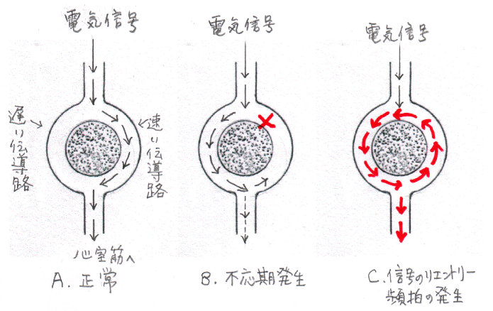 これは私にとっては凄く難解な現象であった。いまでも難解であるが、おおよそ理解したと思われることを図を使って示してみたい。図.3は、その上部は洞房結節から発信された電気信号が心房筋を収縮させながら心室につなげる房室結節部域に入ってくるところから書かれている。その下に丸く書かれているのはその伝導路はなぜか間に絶縁体を含んだ何ものかに2つに分けられている様子を表している。ひとつは正規の伝導路(優先的に使われている)で速い伝導路と言われ、もう一つは理由は不明であるが遅い伝導路と言われるものである。特に遅い伝導路と言われるものはその実体がブラックボックスであり、ある種の概念上の伝導路であると言われる。 さて、Aの正常の場合には、入ってきた電気信号は正規のルート(速い伝導路)を通って心室筋に送られ、心室筋を正常にリズミカルに収縮させる。しかしBのように、もし正規のルートになんらかの理由で電流が流れることのできない瞬間が発生したとすると(赤い×で表してある)、その電流の行き所はもう一つの遅い伝導路と言われる方へ流れることになる。このように伝導路を構成する細胞は、神経細胞などと同じように、その細胞が刺激を伝達する時にはそれなりの準備が必要で、その瞬間の細胞にとって準備が十分でない時に信号が流れてきても、それを次の細胞に送ることは不可能なのである。 私の場合にはどうであったかと医師の方々の話から推測すると次のようになる。たとえば次のように言えばなんとなく理解できそうである。つまり、信号がトン・トン・トン・トンと規則正しく、しかも伝導路細胞が処理できるような頻度でやってくる時には問題はないが、私がかなりの速度で走ってきて心拍数が、つまりは拍動を起こす信号の頻度が高くなってきた時に、突然なにかの弾みで(あとで少し議論したい)かなり速い信号が、ト・ト・ト・トと送られてしまった場合には、伝導路側の対応が間に合わず、その場に突然の「不応期」が発生する。そうなると電気の流れは行き場を失い、もう一つの相対的に「遅い伝導路」に雪崩れ込むことになる。しかし、その2つの伝導路が合流するところにやってきた信号は、速い伝導路はもはや不応期ではないのでその伝導路を逆に廻ることが生じてしまうのである(C)。これが「頻拍」である。そしてこの回路を電流がしばらくの間流れ続くこととなり、元々高い頻度の信号から発生した電気の流れであるために洞房結節からの正常の遅い信号が流れてきてもそれが速いサイクルの中に入り込むことがなかなかできず、かなりの時間持続することになるのである。これが私の考え得る最も分かりやすい理解である。本当に正しいかどうかはまだまだ分からない。 |