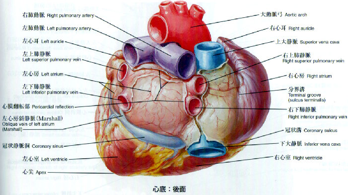 | 上の図をご覧いただきたい。私の場合、そのようなセンサーや心筋に刺激を与えるために通電できる先端を持つカテーテルを右脚の付け根の大腿静脈から下大静脈を通して3本(@、A、B)、右上腕静脈から上大静脈を通して1本(C)を入れ、右心房上部(@)、右心室下部(A)、冠状静脈洞(C)にそれぞれ1本、そして最も異常伝導路が存在すると思われる房室結節―ヒス束の近くに一本(B)を置き、心臓を様々に刺激しながらどのような刺激伝導路が存在するかを詳細に観察し、その部域を精密に決定し、高周波による焼灼、つまりは電子レンジのようなものによる焼灼の手続きに入ることになる。なお、左心房左心室周辺の異常部域を観察するために冠状静脈洞にCとしてカテーテルが置かれているが、これは心臓を裏側から見た下図に見られる横に走っている青くて太い静脈で冠状動脈から心臓を養育して集まってきた血液を右心房に戻すための血管で、その中に留め置かれたものである。なお、この図の右側に上からと下からの大きな静脈が2本あり、それぞれ上大静脈、下大静脈でカテーテル導入に使われたものである。 | ||||||||||||||||||||||||||||||||||||