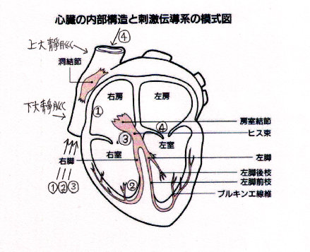 心臓はそれを体外に取り出しても自律的に拍動するほど自立性が高い。それは下図にも書かれているように、右心房上部の上からの大きな静脈との接合部付近に洞房(洞)結節という部域があって、そこの細胞集団が自律的に心筋を拍動させる電気信号を発信しているからである。そこが1分間に60回の信号を発信すれば正常の場合には心拍数は60回になるのである。ただし、刺激(電気信号)が伝わる仕組みはかなり複雑である。心臓は上の部分に心房が左右にあり、その下の部分が心室で左右にある。全身の血液が静脈を通して戻ってくるのは右心房(図では向かって左側)で、全身に血液を送り出すのは左側(向かって右側)の心室からである。血液の流れは次のようになる。 全身からの血液は、上および下大静脈→右心房→右心室→肺動脈→肺静脈→左心房→左心室→大動脈から全身へ さて、洞房結節の電気信号は特別な伝導路を持たない心房内を心房の心筋をゆっくり収縮させながら伝わり、心房と心室の境界に位置する房室結節に収斂し、そこから速い刺激伝導路であるヒス束、プルキンエ線維を経て心室の心筋を収縮させる。これがあらすじである(下図参照)。 |